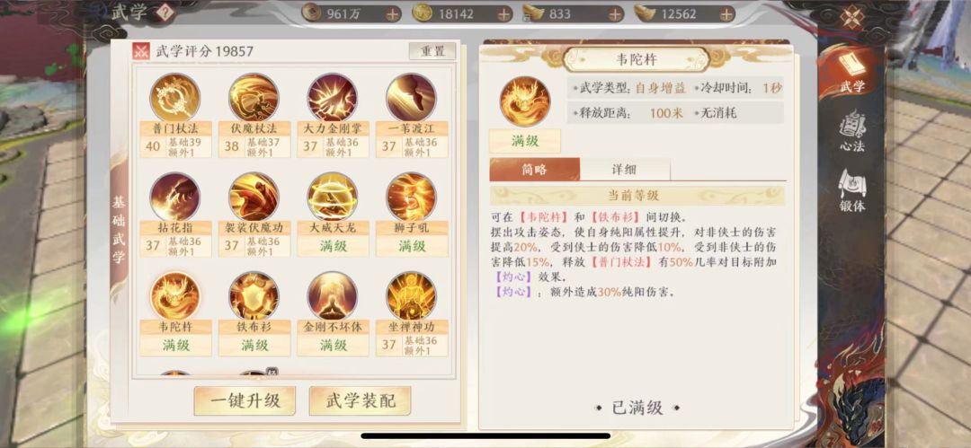 无尘输出流打法的核心还是在他韦陀杵状态下的属性攻击能力等于是每一下普攻附带15%的属性伤害,加上额外的对怪20%伤害,再考虑到无尘的普攻本身的数值就不低这个因素,所以我们单是光看普攻的话,无尘妥妥地能位列六大门派之首。