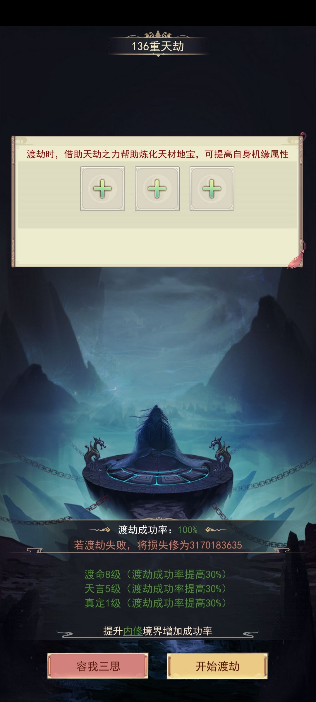 升大境界时需要渡劫丹,可以在珍宝阁或门派兑换。 散仙前渡劫失败不损失修为,但一段时间内不能再次渡劫且天材地宝作废。 (⚠️注意境界越高渡劫失败休息时间越长⚠️)如果不完成内修提升境界更快,欧皇可以30%一直渡劫赌脸。