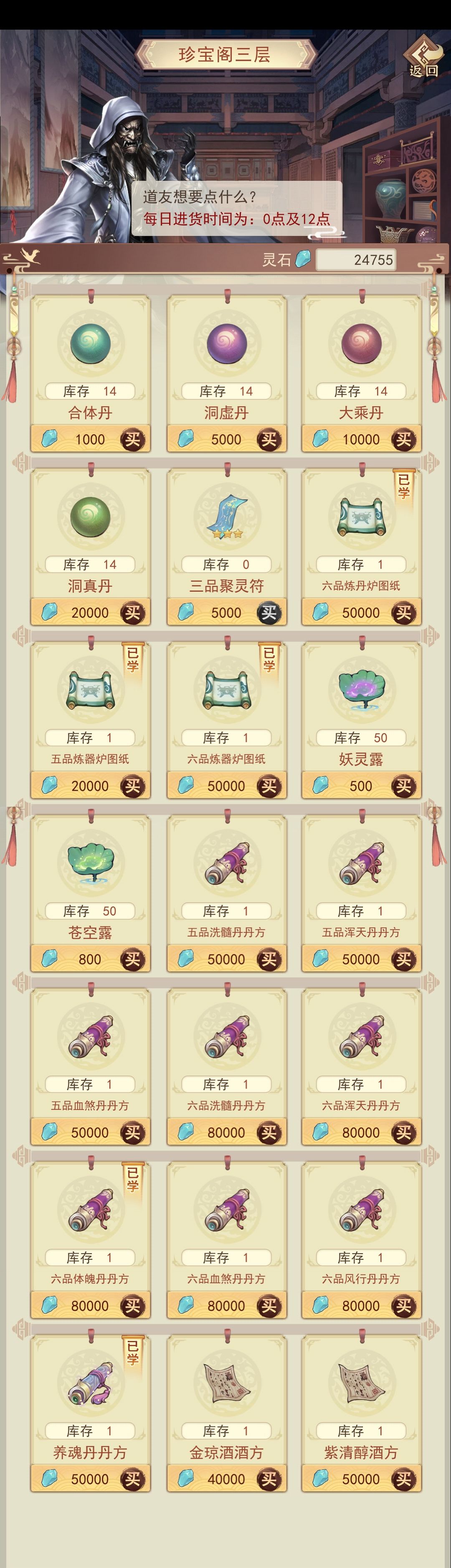 珍宝阁三层可用灵石购买酒方,喝酒加修炼速度