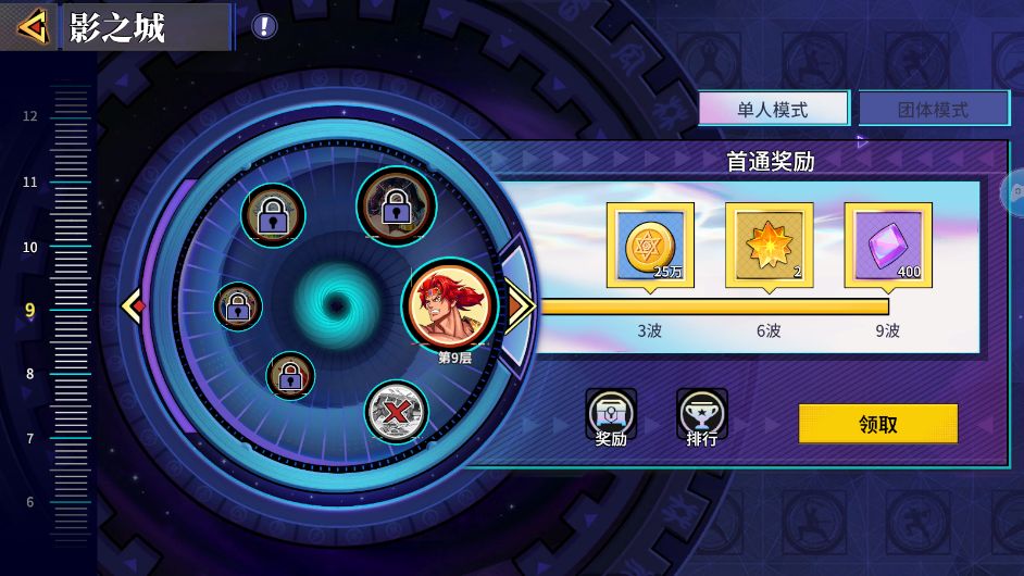 【影之城】为《猎码计划》游戏内一个多模式PVE玩法,每天会开放一个挑战模式,影之城分为单人模式与团体模式,单人模式只能使用1个武道家出站(额外选择2名候补武道家),全体模式则是上阵最多5个武道家一起出战。