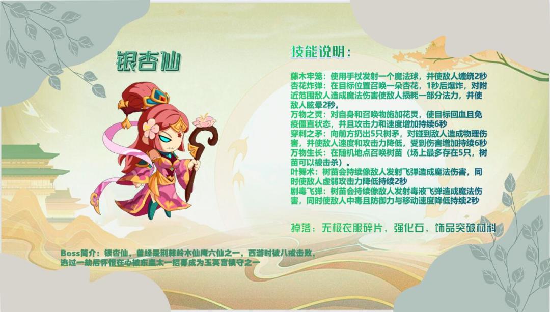 上仙们下午好!仙宫药圃即将开启,全新Boss登场啦!大家都摩拳擦掌迫不及待想将她斩于刀下了吧~今天爆料君前来助各位上仙一臂之力,带来了银杏仙的掉落列表和技能说明噢~