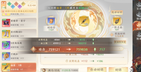 和之前上+6差不多,这次+7也是平均20张刻铭上+6,自动模式下一共看了自己装备上了3次+6,然后就成功+7了,就概率上来说还是很接近显示的强化成功率的,总共开销60+刻铭符0灵晶,这样算的话纯元宝开销可能比上6后用灵晶上7要稍微贵一点。
