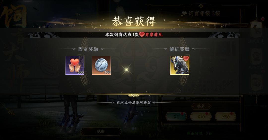 -每次喂养均会触发一种关键事件,不同等级的事件获得的奖励也不同,事件奖励分为固定奖励和随机奖励,随机奖励根据触发的事件有所区别,当玩家触发异禀非凡时,有几率从随机奖励中获得绝影碎片。