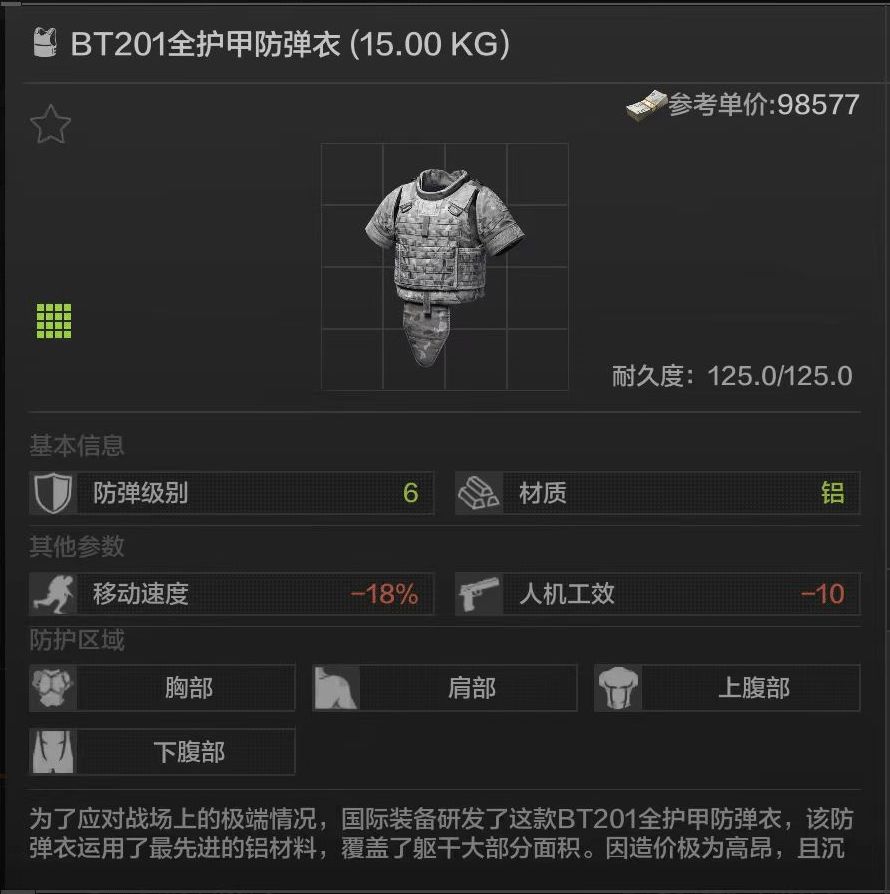 铝制的BT201全护甲防弹衣在游戏中重达15KG