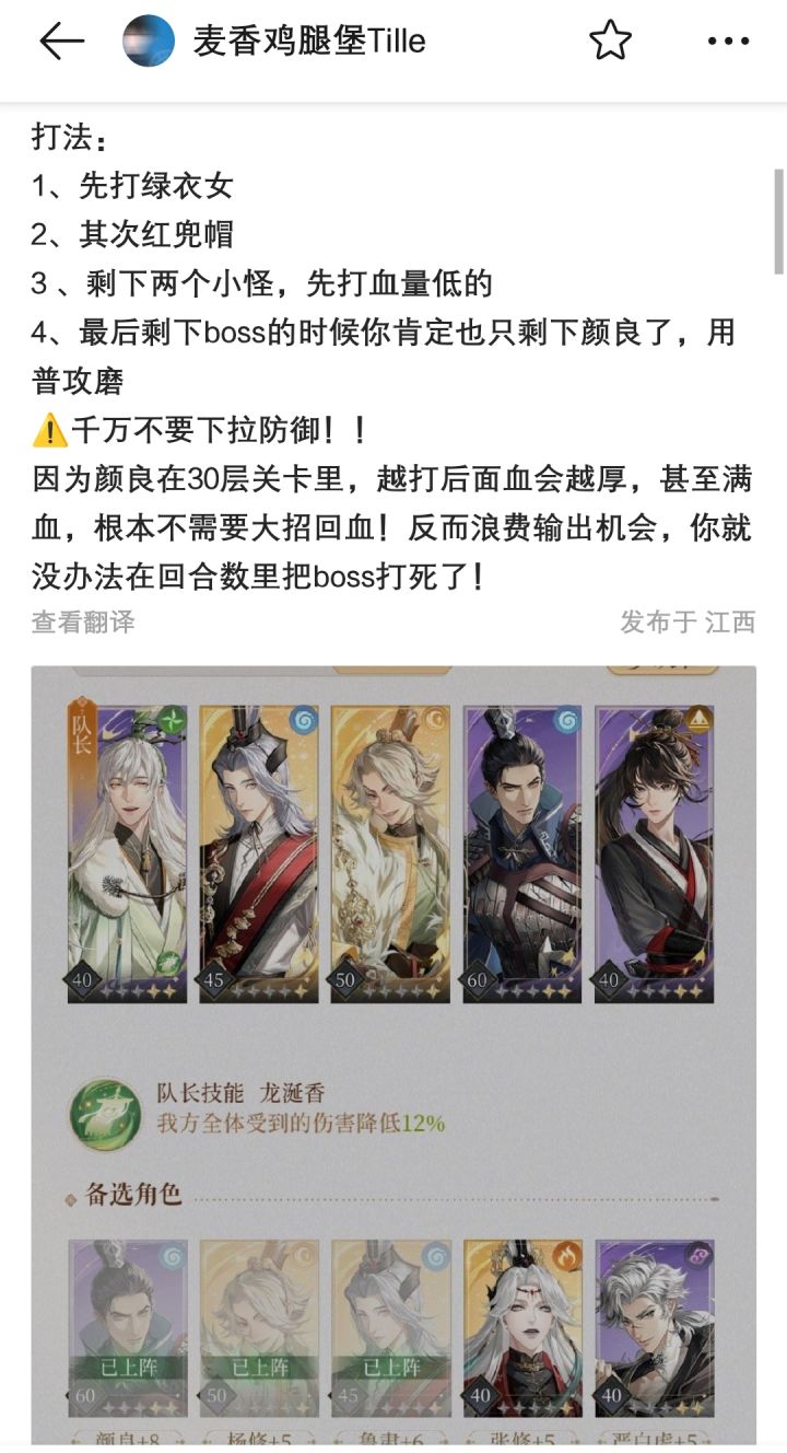 之前练度太低打不过桃源普通30,升级杨修和颜良60级后就打过了,其他密探均50+7,阵容和手法如图。