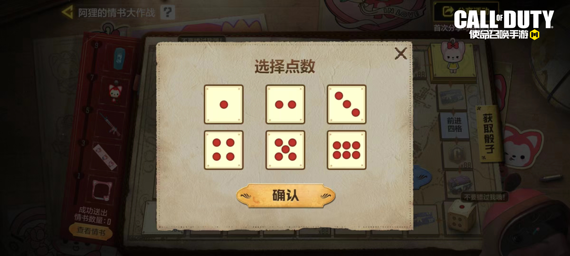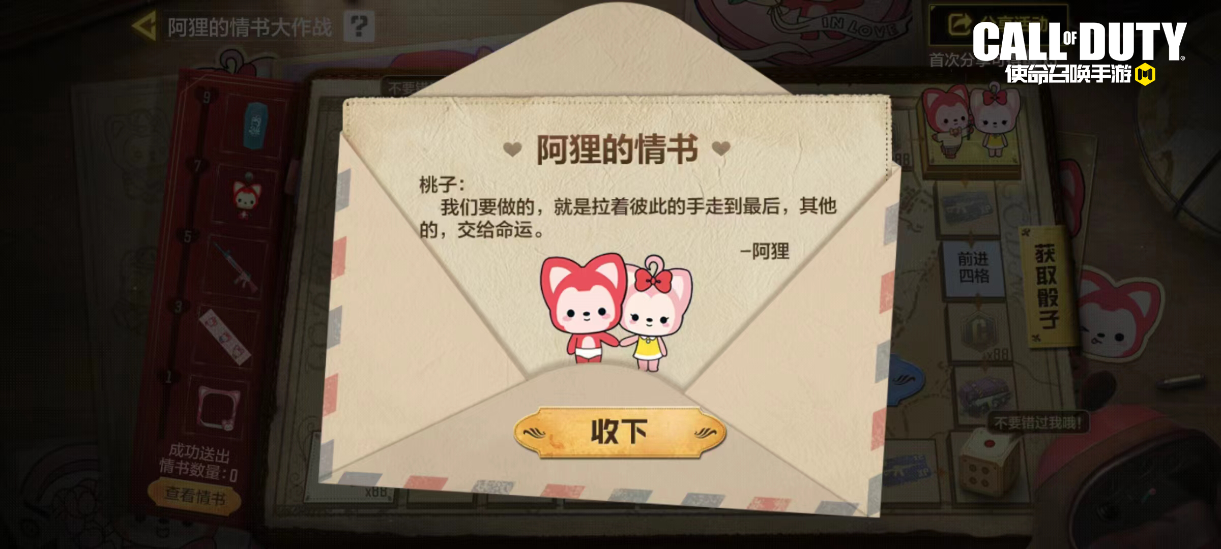 活动的秘籍就是在阿狸快到达桃子位置前保持身上至少有1个万能骰子,重复以上步骤每天可成功送出1~2封情书,轻轻松松完成9封情书的任务~
