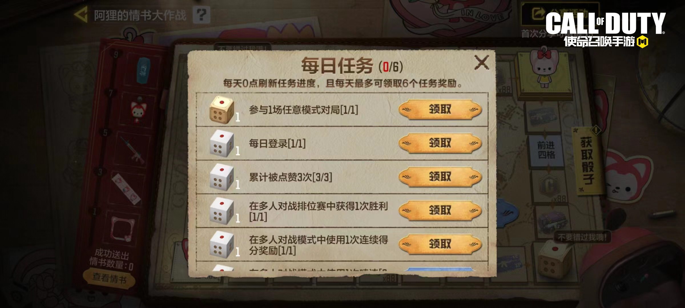 由于每日任务每天最多只能完成6个,所以切记一定要优先把第一个任务完成领取万能骰子,然后再领取剩余5个任务的普通骰子;