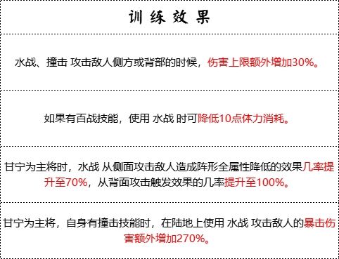 作为东吴水师强力底牌之一,锦帆军在甘宁的带领下将会变得更加强大。除上述加成外,还将获得 无视敌军协同防御和正面迎敌 的效果,同时大幅增加水战的暴击伤害,甚至还可以让敌人阵形的全属性下降!作为一支实力不容小觑的中坚力量,相信锦帆军将会为主公们在多个场合展现其强大的实力!