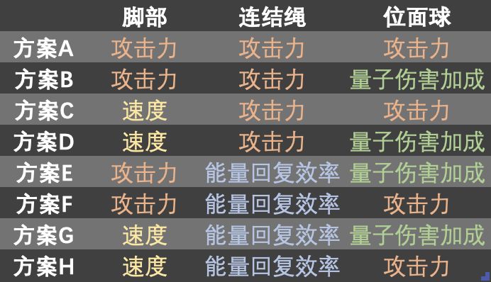 - 由于大部分玩家不太可能达到极限完美的副词条,因此剩下三个副词条乘区是用来歪的QaQ。在本攻略中,还考虑了速度7、攻击力10%+48的有效副词条(仅占用1-1.5个副词条乘区),比较符合实际情况。 规定了暴击相关属性后,可选择的主词条就仅有上述8种方案了。