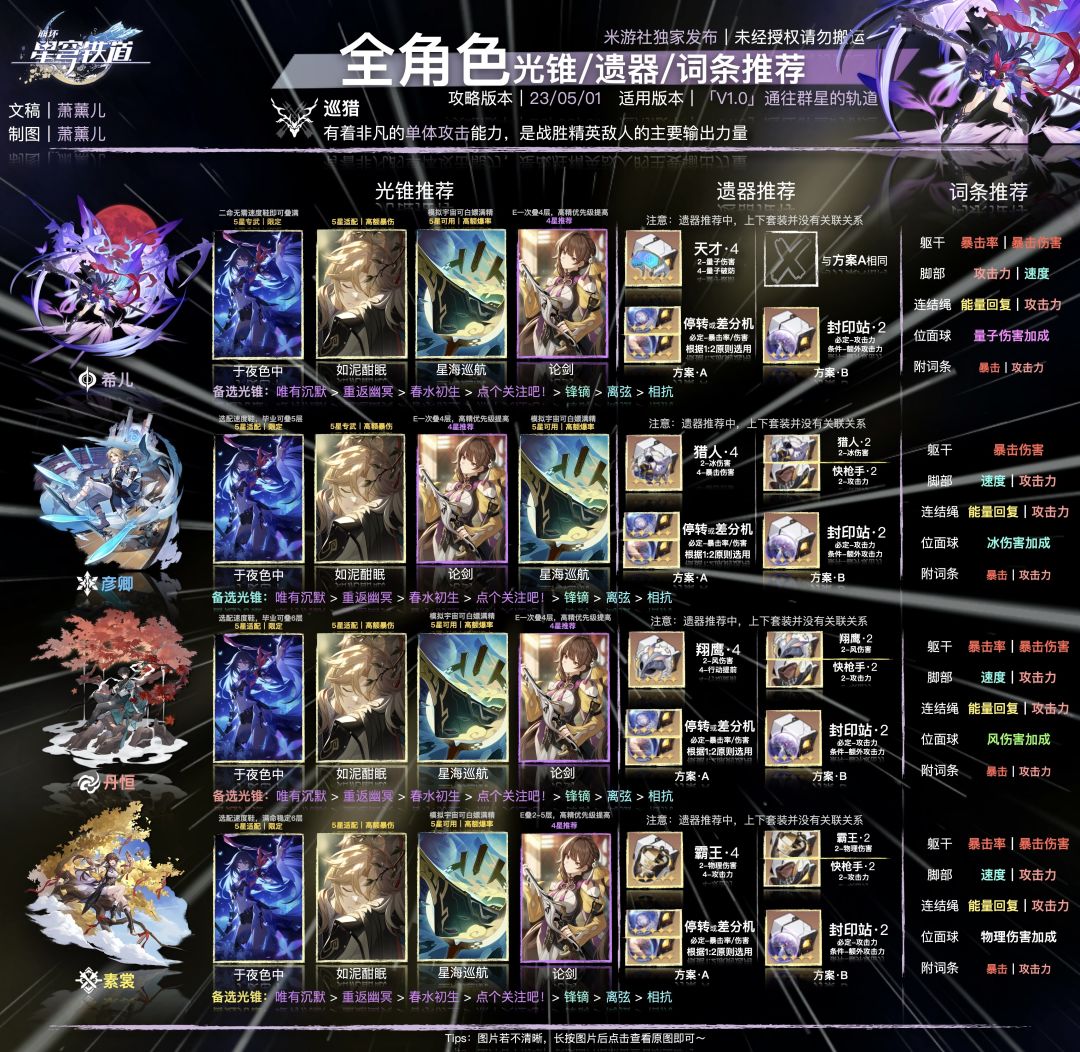 1. 根据公测调整,修改了所有「巡猎」角色的位面球和连结绳的推荐。