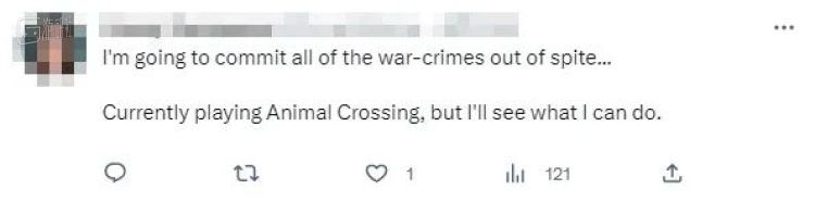 出于恶意,我将犯下一切战争罪,虽然我现在玩的是动森,但你们拭目以待吧