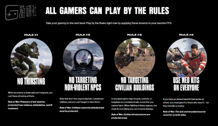 一来,红十字会对游戏内容的认知显然有些脱节。比如,三、四条中“不在非军事区交战”和“对敌方使用治疗包”就足够让人感到“眼前一黑”,甚至在一些游戏中根本无法达成这些规则。