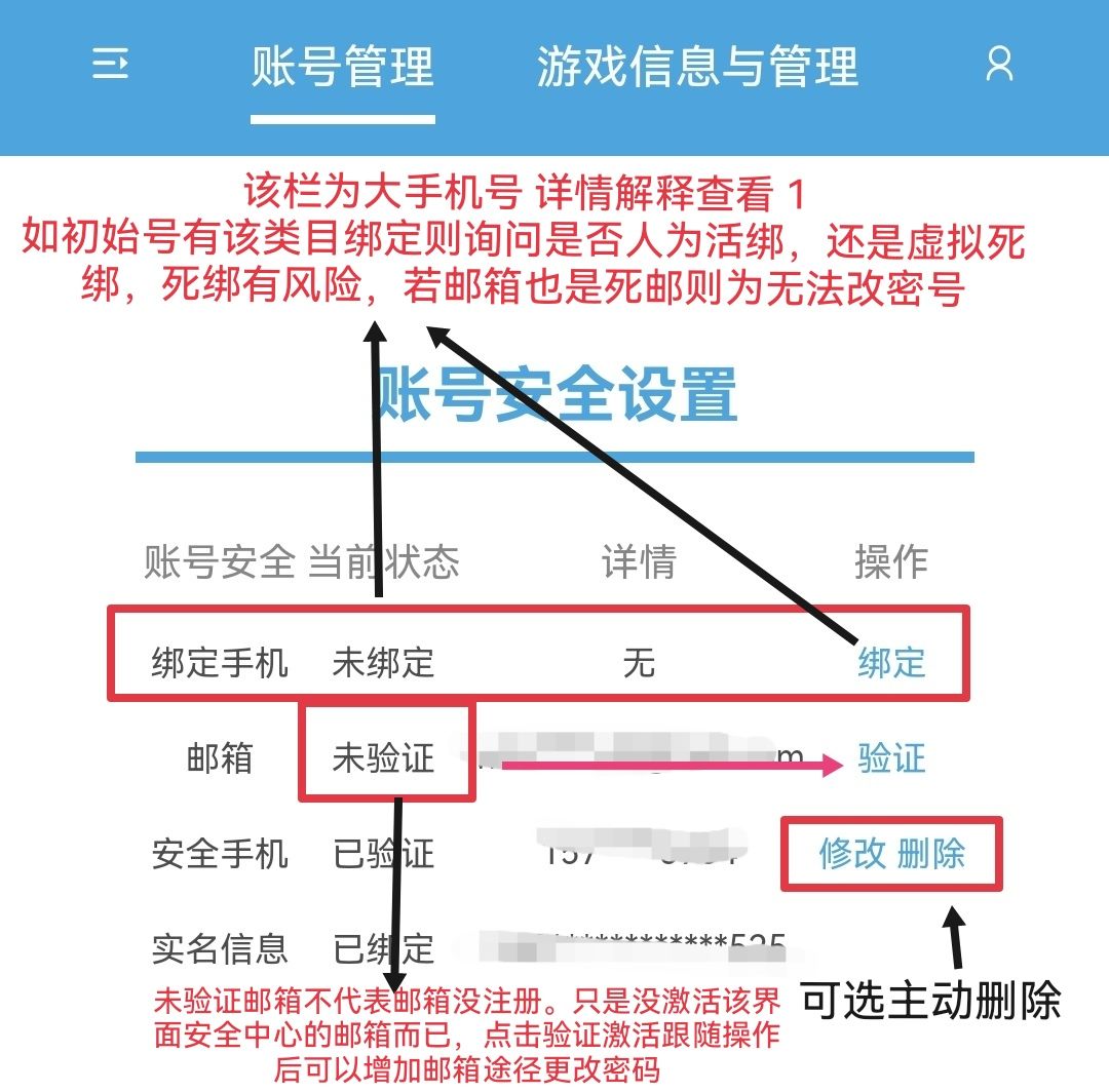3.邮箱手机号绑定(需前往对应邮箱网址的账号安全中心验证)未注册邮箱账号通常出现在初始号中,较为安全。如邮箱无法登陆或对方说明丢失密码,请斟酌选择