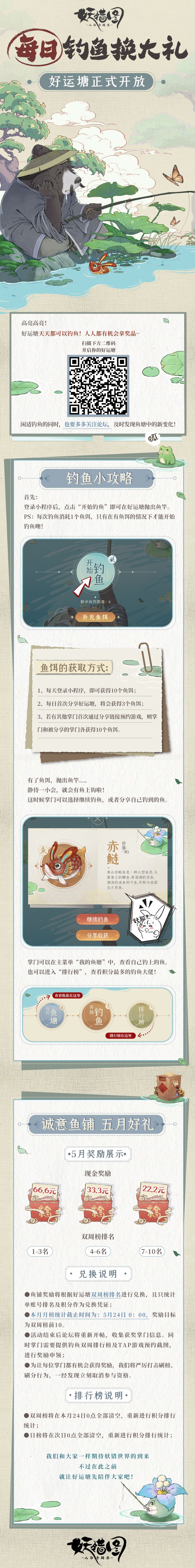带上#好运塘钓鱼 和 #山海异闻录之妖错图 两个话题在论坛分享钓鱼成果,即有机会赢取现金奖励~