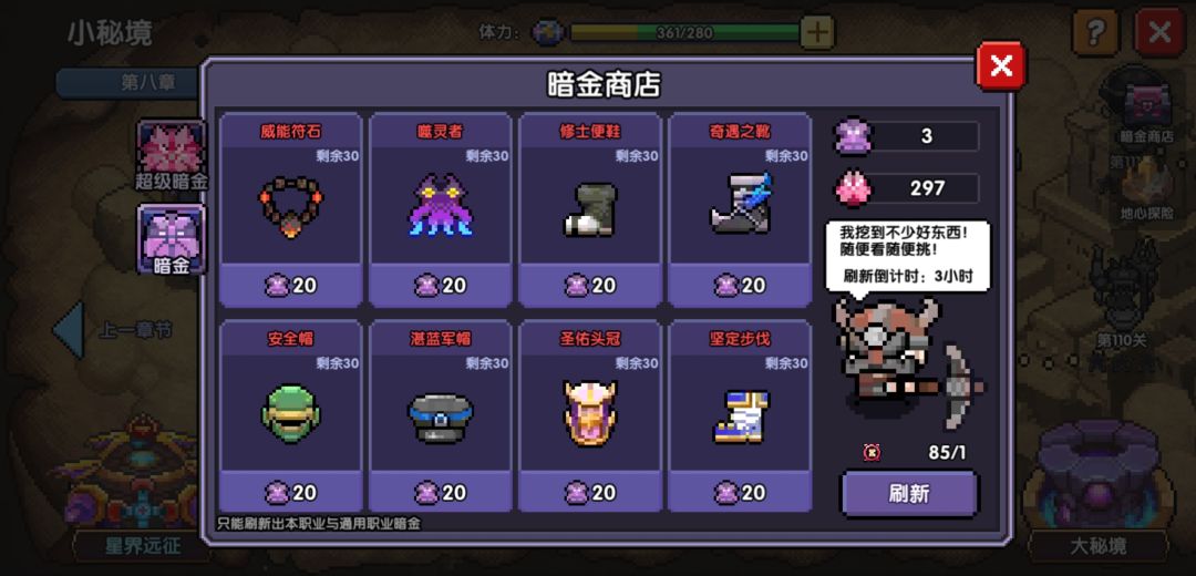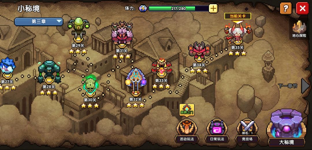 两种房间每打一次都会掉落邀请券,集齐10个开启特殊闯关奖励丰厚并且都会获得电池(兑换体力,每周上限20个800体力)。密藏地宫奖励电池数量随机(建议至少攒20个邀请券再进入),暗金矿洞每次奖励2个电池