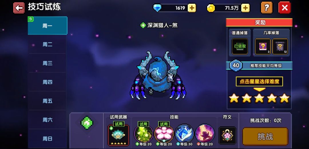技能试炼每成功通过一个难度别领箱子直接退出游戏后台,这样可以不消耗挑战次数,直到打满五星再领取奖励
