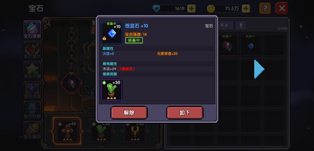 宝石开启:词条推荐有元素穿透和护甲穿透的,宝石强化+10以内分解返还全部材料