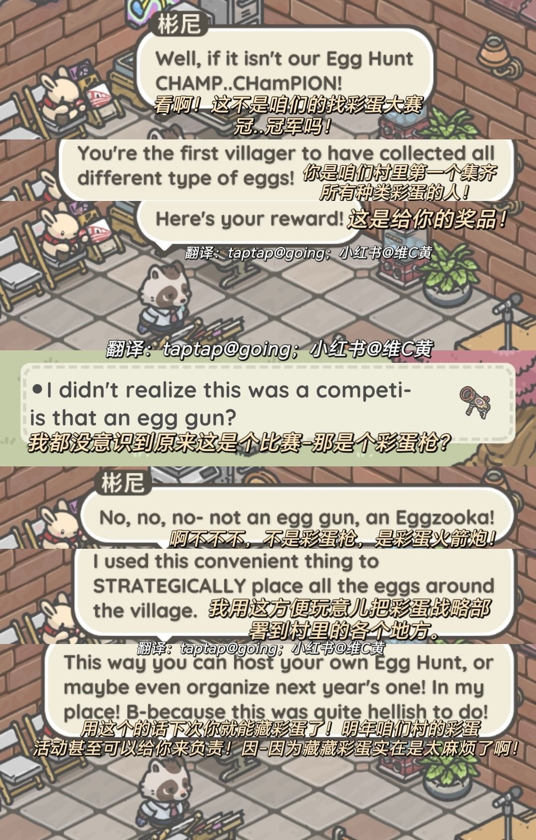 ③找齐13种彩蛋后与彬尼对话,彬尼会送彩蛋枪,可以用彩蛋当子弹,打到别人身上会引起小对话。