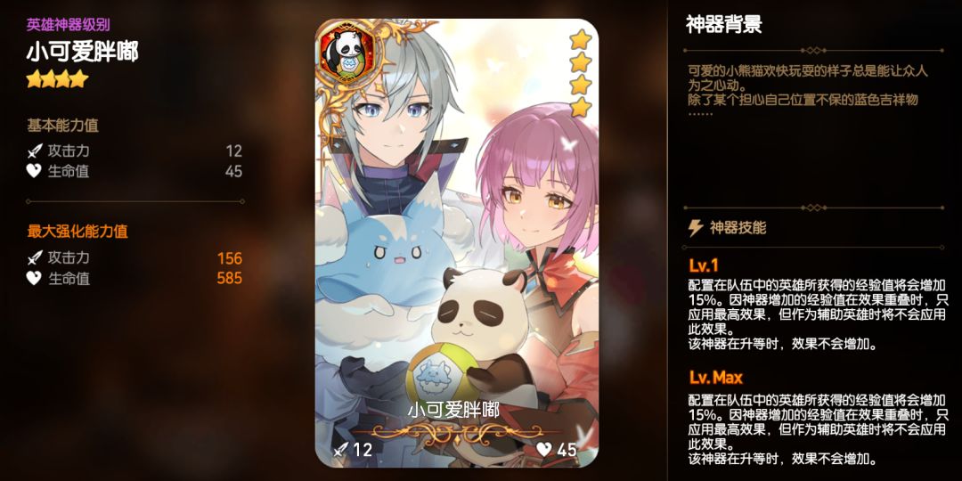 国服限定英雄神器“小可爱胖嘟”将在本次测试中第一次与继承者们见面。神器是拥有独一无二的技能的特殊存在,它将为佩戴它的英雄赋予特殊的力量。佩戴神器“小可爱胖嘟”的英雄若配置在队伍中参战,将得到相应的经验加成。继承者参与游戏内的限定活动即可获取该件神器。