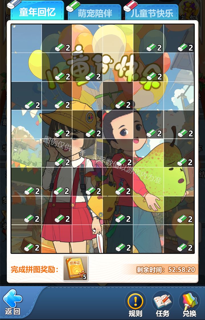 3) 新增活动“童年拼图”:通过活动可获得裁缝包、金牌宠物三选一、陶子和孔融二选一、新头像框、文理科通知书、特招通知书、玉佩、银点子等各类好礼;(*更新后,不定期开放)