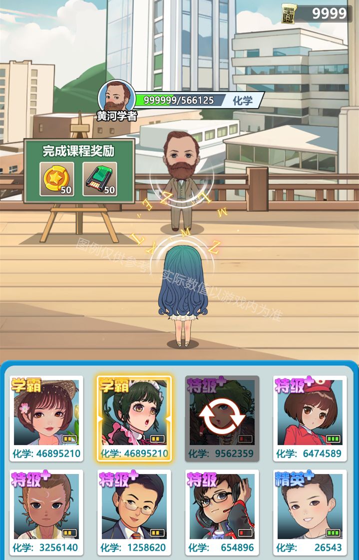 - 闯关玩法:每关都会设有9科其一的1名学者,派遣已开启对应科目的,且有交流次数的学生上前交流,可减少学术学者的精力。当学者精力为0时,即完成一次该学者的学术交流,该关卡的学术交流进度+10%,当完成10次该学者的学术交流,即该关卡学术交流进度为100%时,则闯关成功,进入下一关。学生科目分数(不含已穿戴的辅导书)越高,能减少学者的精力值越多。