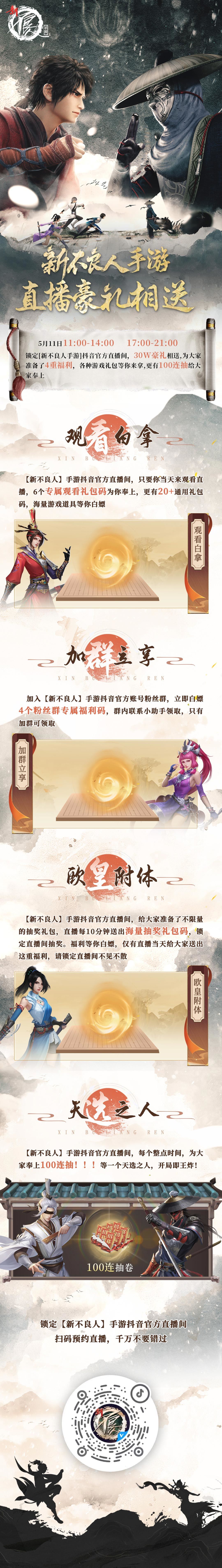 锁定【新不良人手游】抖音官方直播间,30w豪礼相送,为大家准备了4重福利,各种游戏礼包等你来拿,更有100连抽给大家奉上~