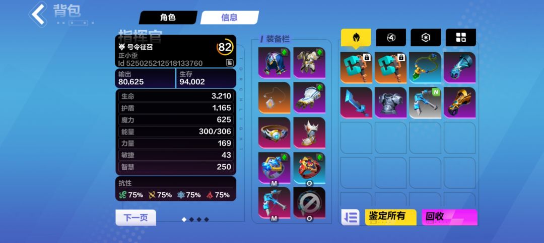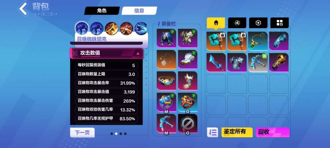 可以看到其实除了一把武器。我其他装备都是用的加防御的。但召唤还有很多拉伤害的专用防具,但我没有,加上的话一两亿秒伤没问题的。我觉得召唤还是要考虑生存。但我现在比较厚就没带防护技能,后期换了增伤装备生存能力降低,防护技能也要安排上的。