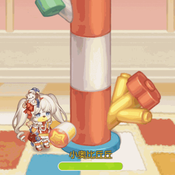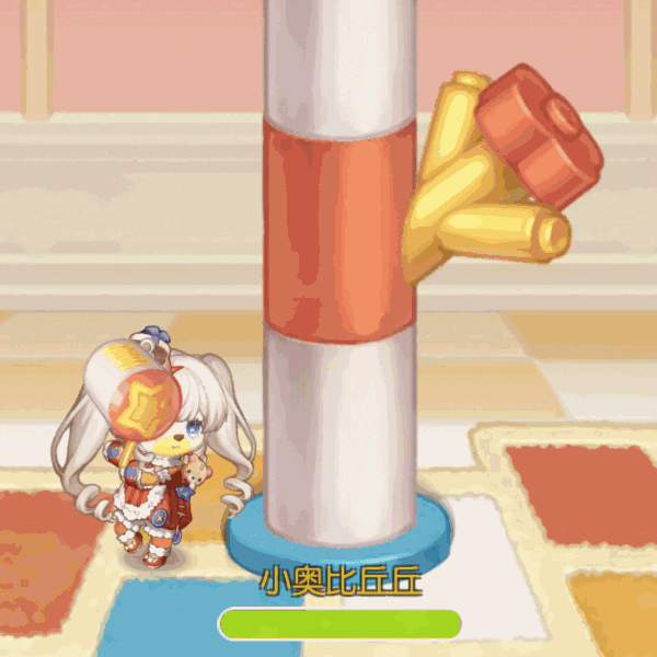 进入游戏后,点击“左锤”或“右锤”即可锤飞积木柱子,小心不要被凸起的积木柱子砸到头,也要注意不要碰到另一侧凸起的积木,这样才能顺利闯关噢!参与玩法还可以获得「玩具发条」,可以前往「发条吱吱」商店兑换可爱童趣时装和家具哟~奥比们快快登岛体验吧!