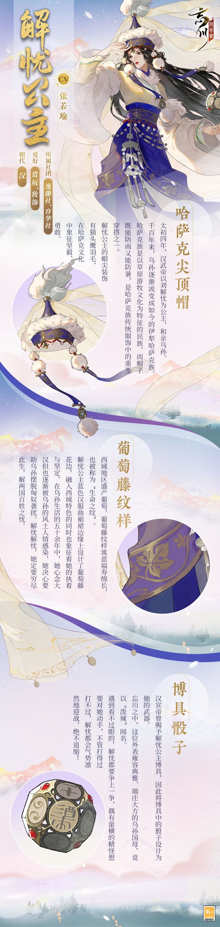 刘解忧,汉元狩三年生,楚王刘戊之孙。为与乌孙国结好,遏制匈奴扩张,刘解忧和亲乌孙。在乌孙生活的五十余年,她积极投身政局,为汉朝与乌孙的盟好做出巨大贡献。