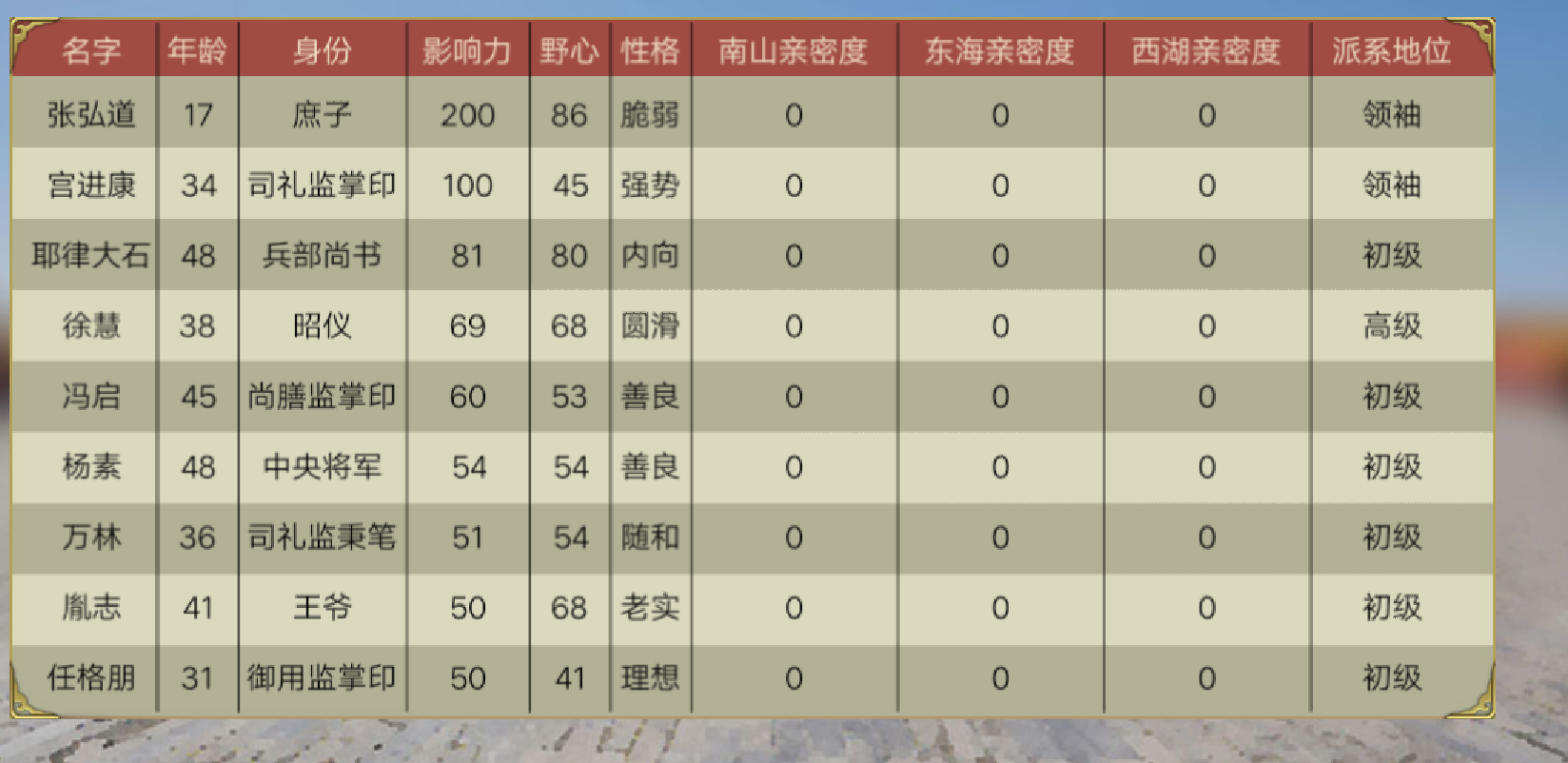 我翻了一下,发现只有少数几个大臣还有一点亲密度,其他的都是这样,我是不是要凉了?