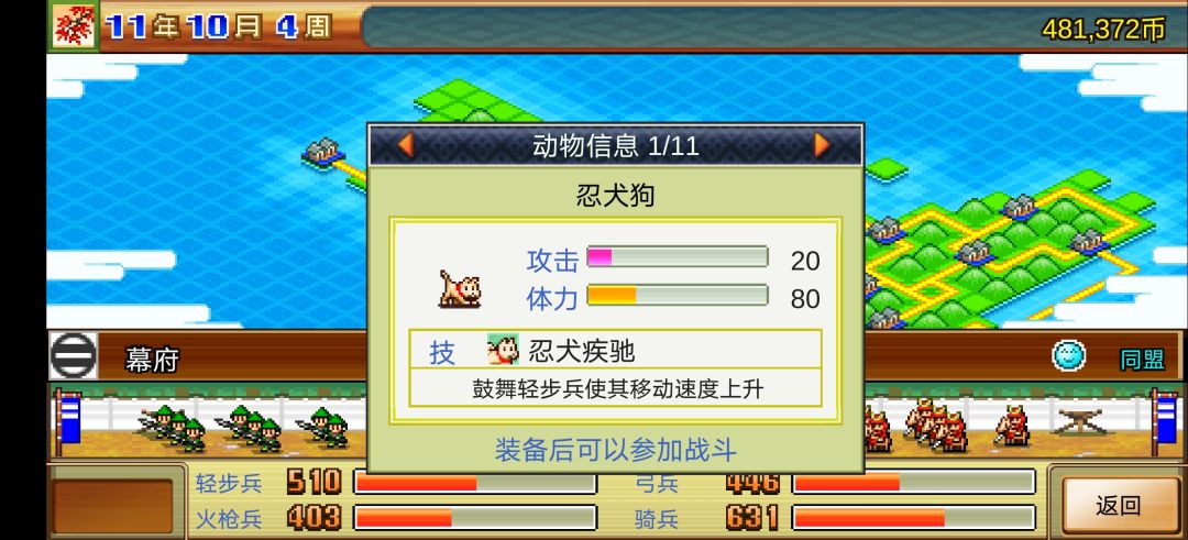 忍犬:装备后加入步兵,提升步兵移动速度,建议使用。