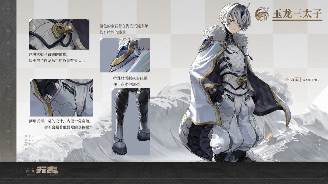 设计师遵循玉龙三太子贵为龙族后裔的设定,服饰上以白色为主,典雅大方,还加入了鳞甲设计。在材质和配饰上,则融合了其他时尚元素,结合架空的世界观,给予角色焕燃一新的视觉体验