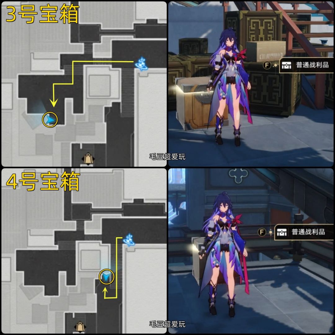 回到“星槎码头”传送点,这次朝地图左侧前进,3号宝箱藏在楼梯旁的“货物”中间,拿完后再次回到传送点,顺着楼梯朝地图下方前进,下楼梯右转,宝箱在角落里。