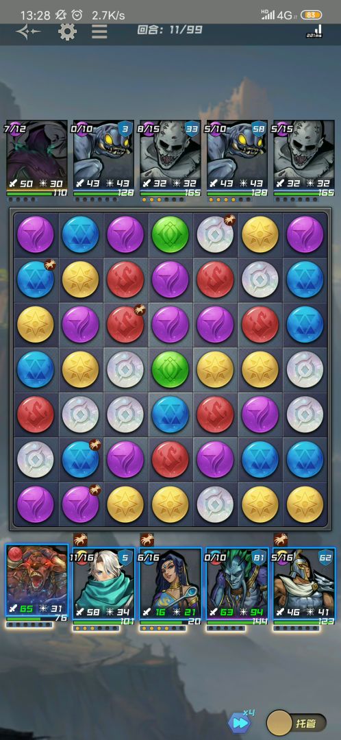 首先通过红色能量球(随从阵营颜色)的消除,1号位牛积攒满了能量(随从左上角能量球亮起),次数已经可以发起技能攻击。其次在消除能量球的同时随从下方的怒气自动积攒,积攒满后,自动普通攻击,怒气积攒的普通攻击每回合一次。