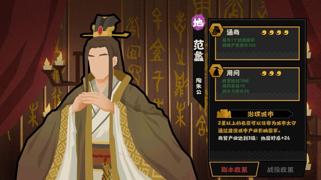 3. 和自身政策最搭。剩下就两个名臣范蠡和王昭君,王昭君只有在做汉匈相融结局时才优于范蠡,而范蠡的两个政策和太守技能都能很好的配合起来,具体后面详细讲。