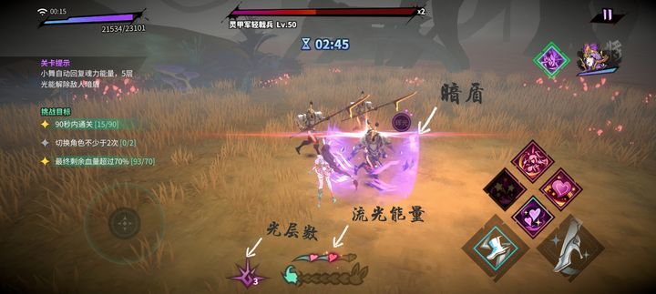 这关小舞流光能量会自动恢复,普通攻击或者完美闪避也会获得流光能量,三格能量后长按主角技把3格流光能量转换为5层光层数