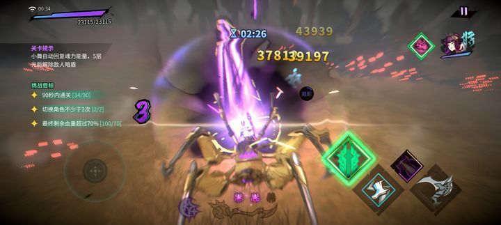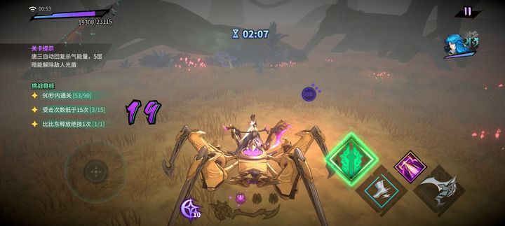 这关会持续掉血,攻击以后会恢复生命,建议前面用唐三叠10层暗以后切比比东输出,血线危险的时候用小舞回血,这关三星需要2次完美闪避,蜘蛛三连冲的时候最容易刷完美闪避。