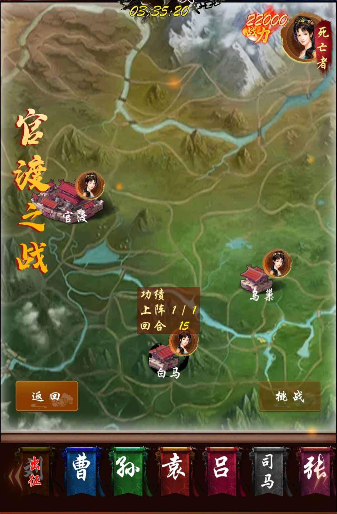 官渡有三座城,人口最多分别是1,3,12,建议用曹操或者孙权。