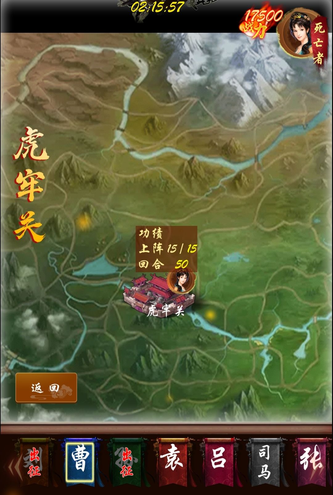 虎牢关:虎牢关只有一座城,最多可以上阵15人口,建议用刘备