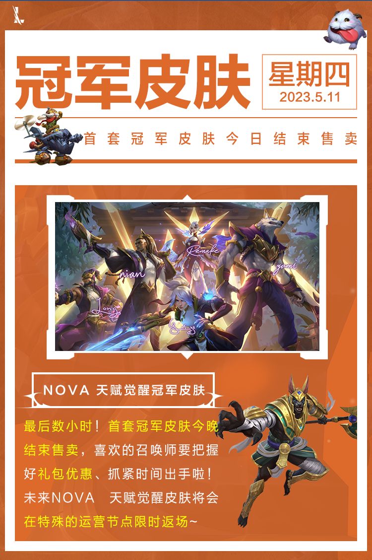 在开始今天的新版本内容之前,得先将现版本的重点内容完成!NOVA 天赋觉醒冠军皮肤即将于今晚(5月11日23:59:59)结束售卖!请各位召唤师抓住机会,千万不要错过!
