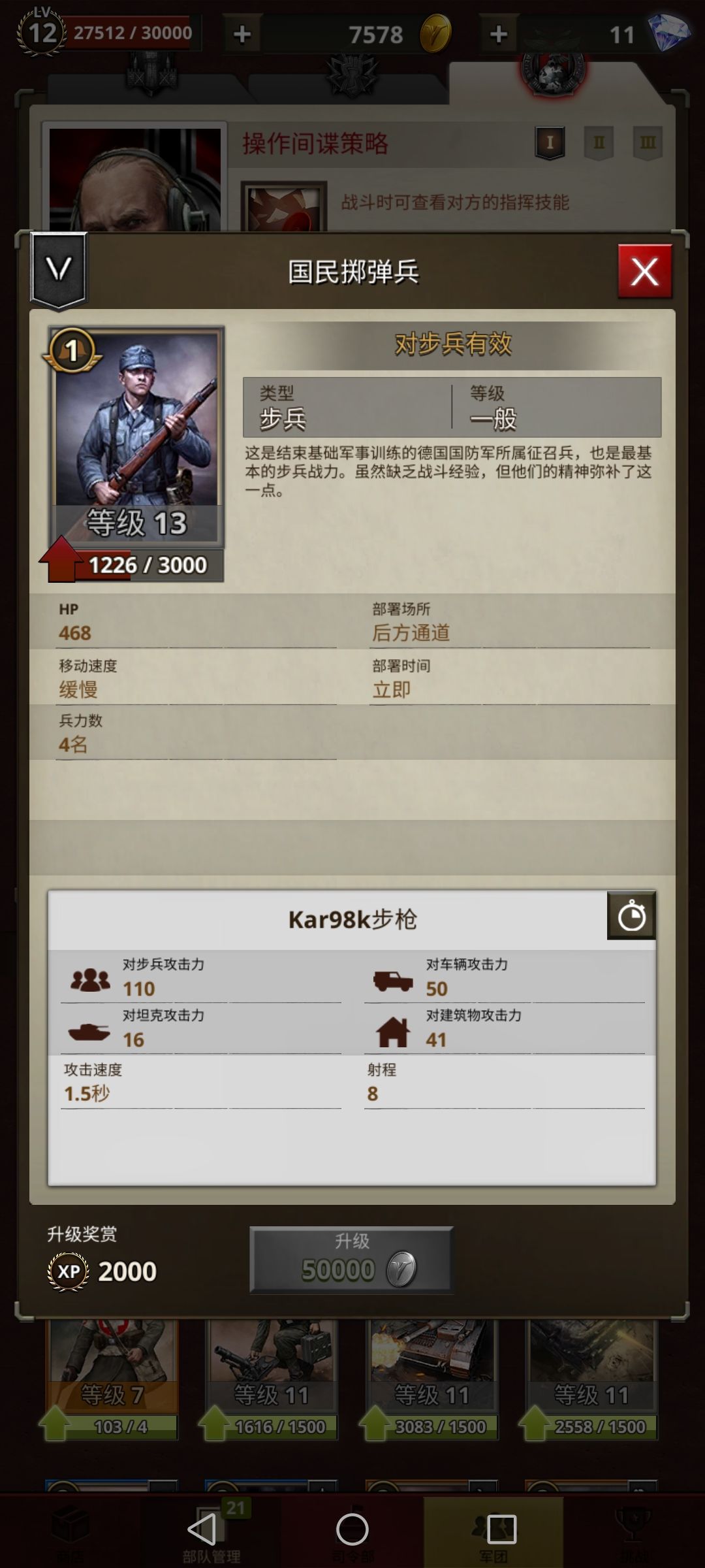 前面说过,主战步兵都很卷。卷到头皮发麻的地步,连身为超人的突击队都看上去像凡人。这位就是国民掷弹兵强化版,衣服都没改。戴上钢盔,撸起袖子,枪械改为MP 38。生命值只比国民掷弹兵强一点点。这张牌一定要和国民掷弹兵一起出,本身是没有办法承受过高伤害的,武器火力也打不过近卫兵。在敌方的装甲单位确定目标之后从侧边杀出进行干扰牵制是这张牌的核心用法,当然,你也可以在国民突击队中混着他们进行藏木于林的特殊辅助战术。如果在投掷集束手雷能触发20%的对装甲单位冲击效果则会事半功倍。这支部队如果用的好可以代替突击队成为战场上的主战步兵,因为才三费换手极快。不过如果玩步兵阵容一定一定要配有四号或者是六号虎式主战坦克,此单位生命值比较脆需要有坦克在前方给他顶着,他过去开路。这是一张十分考验操作技巧上限的牌会用这张牌证明你就已经成功脱离新手概念。
