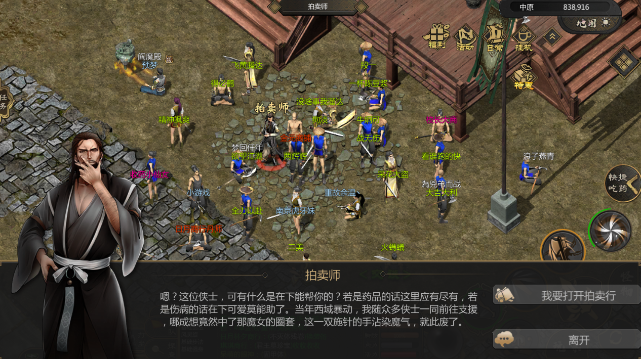 首先声明告诉大家一下交易的步骤,大侠们可以点想交易的大侠,直接选择交易,然后页面出来了就水到渠成了,这是一对一交易,其次就是拍卖行,在中原集市找到拍卖师可以打开商店,就可以看到别人上架的物品了自己也可以上架,也会显示在里面,这是拍卖行的交易。