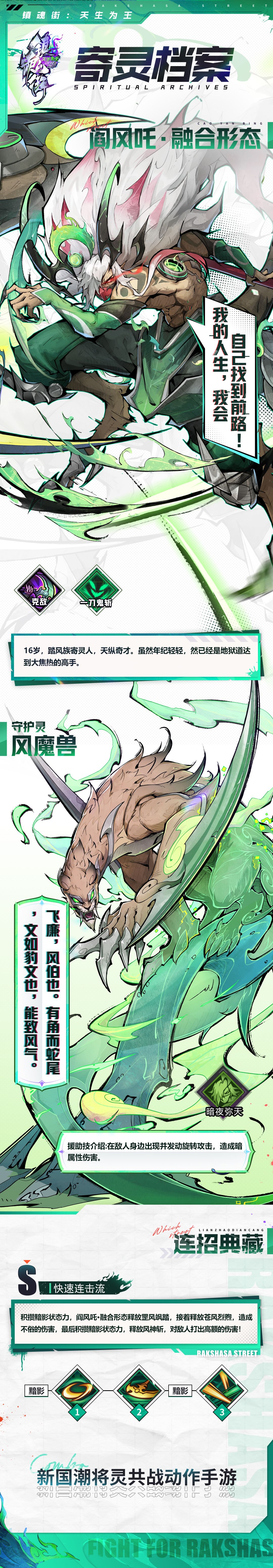 欢迎各位镇魂将来到全新一期的寄灵档案!《镇魂街:天生为王》新版本「循风渡林」将于5月18日正式上线,本期我们将会为大家介绍一位熟悉又陌生的寄灵人!他,曾因控制不住体内的守护灵而摧毁了半条凌风街,酿下大祸,被锁灵石囚禁多年;但现在,他将以磐石般的意志为锁,束缚住体内风魔的疯狂;以将灵间的信任为钥,解放出风魔真正的力量!有请本期的主角——阎风吒·融合形态!