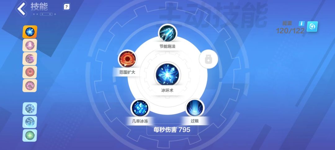 然后技能因为我主要是用冰环术输出的,所以其他全是辅助技能。冰环术我是建议先用范围扩大,然后几率冰冻,我这个图是因为狗屎运出了一件加105能量的衣服所以才能那么快开5个孔。