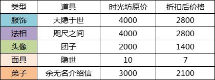 本次更新为道友们带来了新的时光坊商品,上新折扣持续7天,持续至5月22号24点,折扣为7折。
