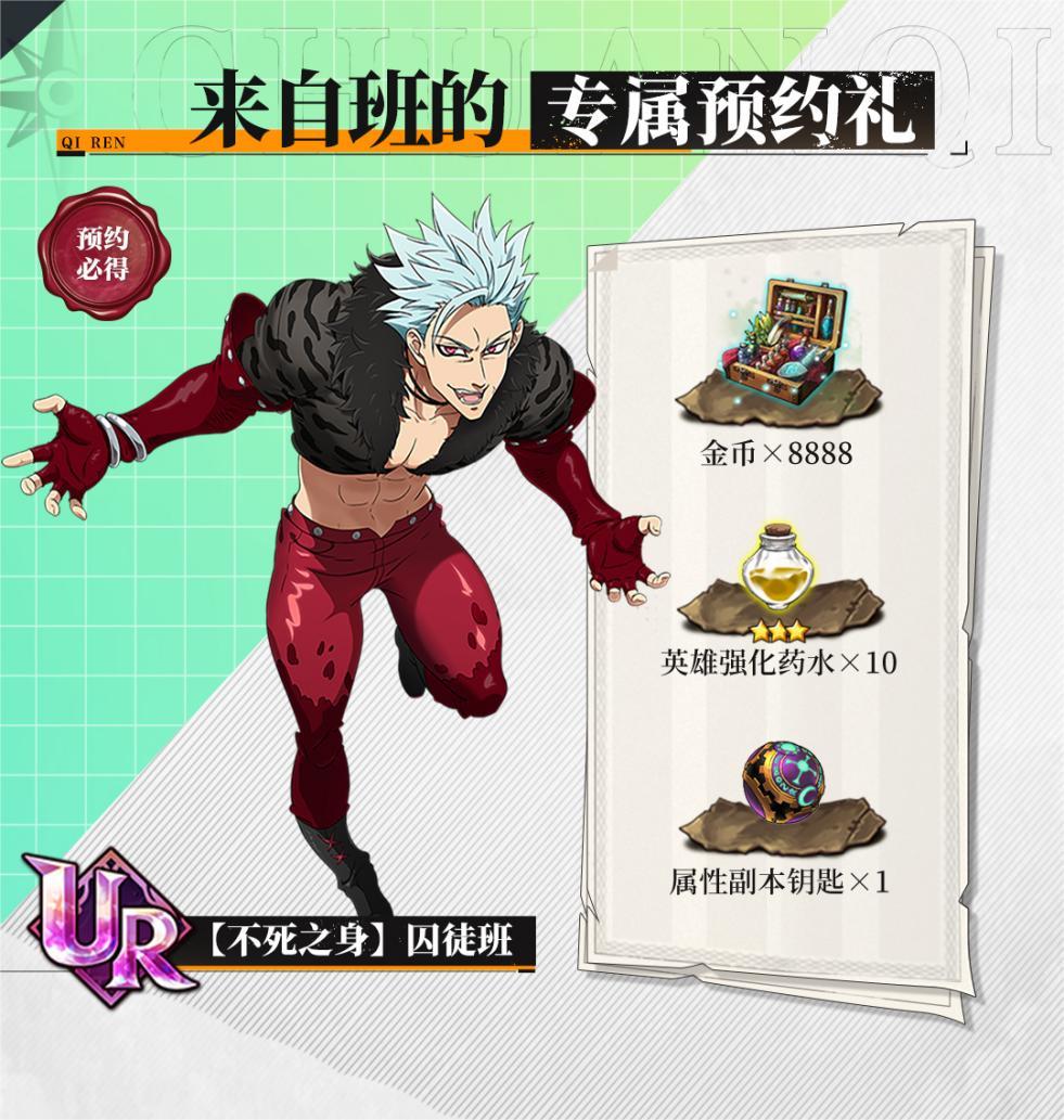 金币x8888,英雄强化药水x10,属性副本钥匙x1,UR英雄 【不死之身】囚徒班(比SSR稀有度更高!!!拥有夺取魔力、削弱敌方的强力能力)