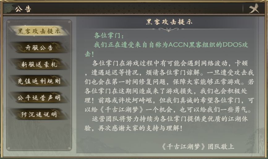 织梦坊是一家刚刚起步的工作室,此次攻击对我们也产生了不小的影响,我们需要耗费大量提防未来的攻击。预计在未来可能仍会出现,登录时无法收到验证码、网络波动、卡顿、延迟等情况,还请各位掌门谅解。