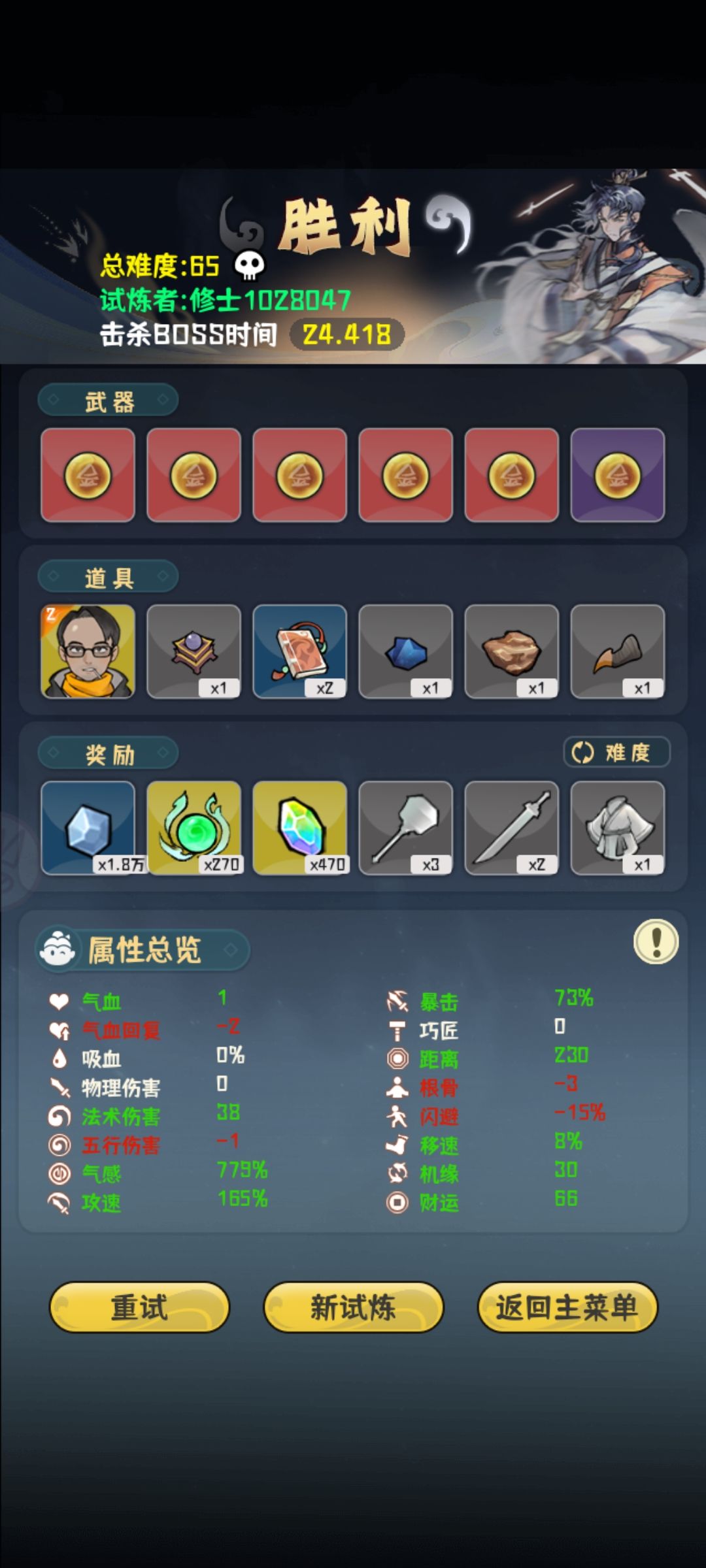 其实这是我第一次打荒古,中间踩了好多坑,比如不知道荒古居然有30关,还有荒古跟普通模式不一样,退出来之后重新进的时候如果没有继续游戏,存档就消失了,导致之前难度70的天胡开局存档没了,怎么刷也刷不出来,无奈降低点难度从65开打。