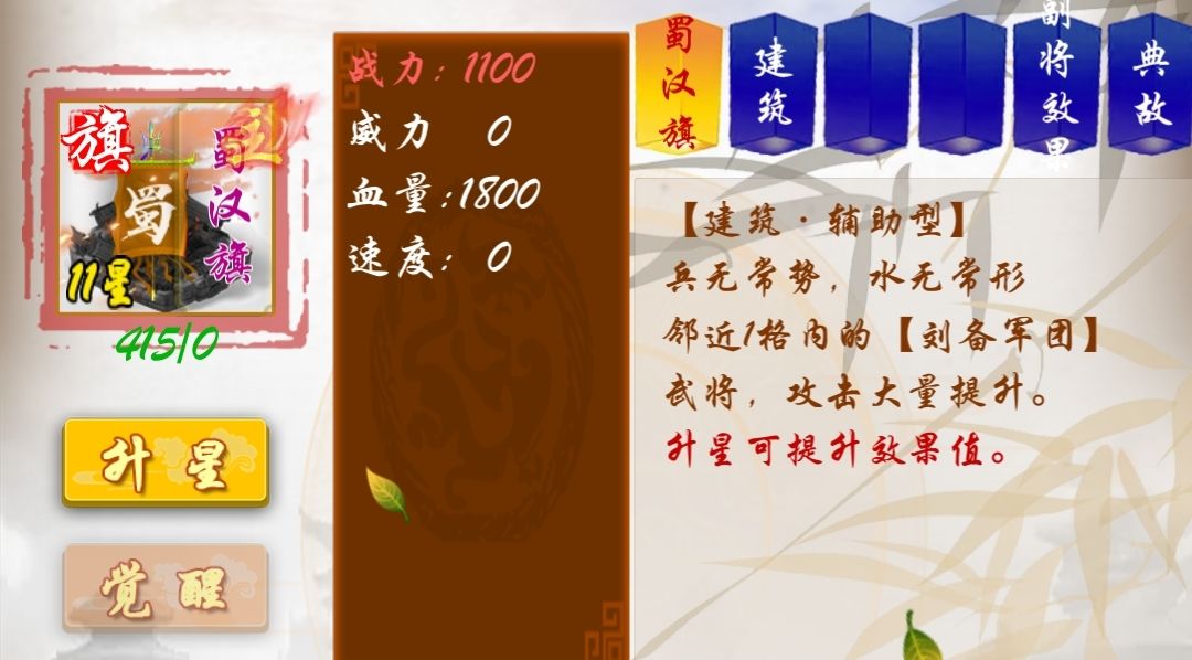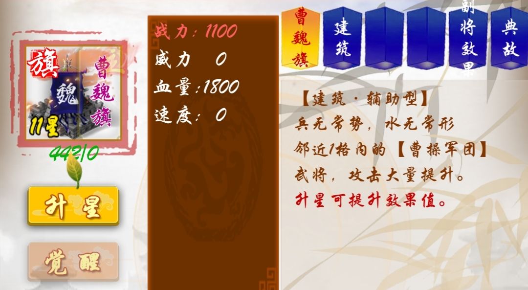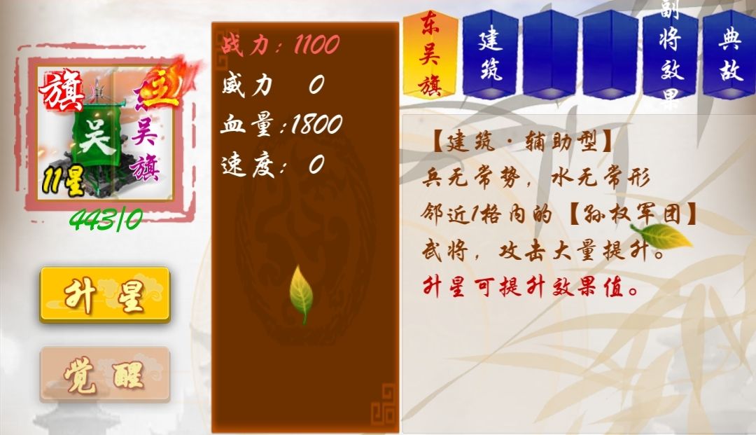 三国旗子1级加成30%,每升级一级额外增加4%