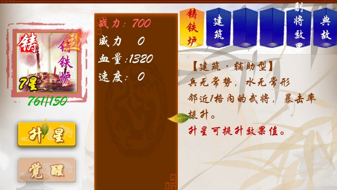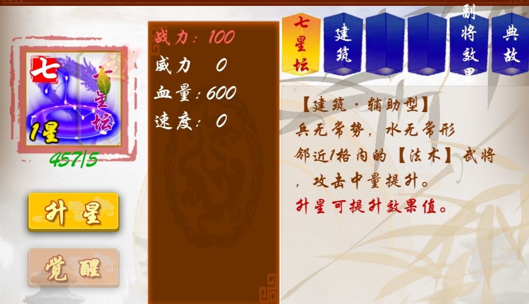 演武台,七星坛,瞭望台,号角台等标有中量提升的均为初始加成20%,每升级一次额外增加3%。